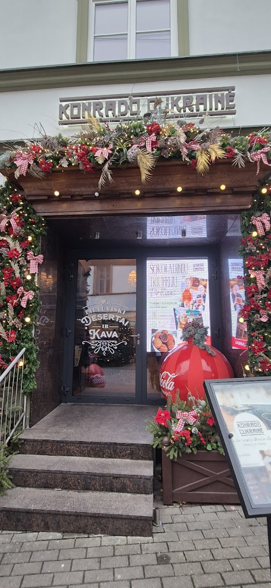 Konrado cukraine is a cozy café tucked into Pilies Street, one of Vilnius’s livelier pedestrian areas. It’s the sort of spot where locals and visitors alike drop in for a relaxed break, often pairing a carefully brewed coffee with an elegant dessert. The setting combines a charming, intimate interior with soft music that helps create a calm atmosphere amidst the buzz of the city center.